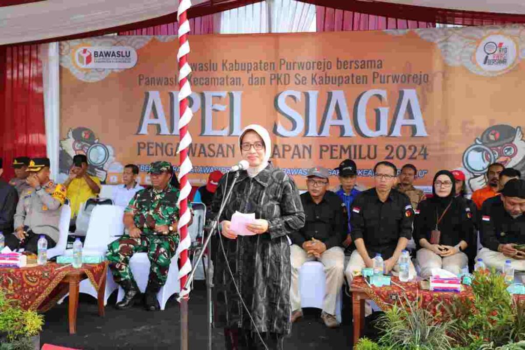 Penegasan itu disampaikan Bupati Purworejo Hj Yuli Hastuti SH saat menghadiri Apel Siaga Pengawasan dalam rangka Pemilu 2024, di area patung Dewaruci Desa Jatimalang, Kecamatan Purwodadi, Minggu (04/02/2024). Tampak hadir Ketua DPRD Purworejo Dion Agasi Setyabudi SIKom MSi, Kapolres Purworejo AKBP Eko Sunaryo SIK MKP, Dandim 0708 Letkol Infanteri Yohanes Heru Wibowo, Ketua Bawaslu Purworejo Purnomosidi SPt, Kaban Kesbangpol Agus Widiyanto SIP MSi dan Pejabat terkait.