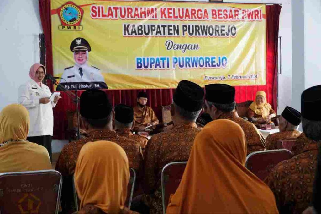 PURWOREJO – Bupati Purworejo Hj Yuli Hastuti SH, menghadiri silaturahmi keluaga besar anggota Persatuan Wredatama Republik Indonesia (PWRI) se-Kabupaten Purworejo di Gedung PWRI, Rabu (07/02/2024). Hadir dalam acara tersebut Kabag Prokpim Setda Kabupaten Purworejo Ulik Sri Widiatmi SSos MAP, Ketua PWRI Kabupaten Purworejo H Soekoso DM SPd, Ketua Kertawredatama Hj Sulastri Tumino SIP, serta pengurus PWRI dan Kertawredatama.