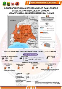 WASP76NEWS.COM||Sukabumi-Jumat 31 oktober 2025 Bencana banjir bandang dan tanah longsor di Kabupaten Sukabumi yang dipicu cuaca ekstrem sejak Senin (27/10/2025) telah melumpuhkan dua kecamatan, Cisolok dan Cikakak. Dampak bencana ini tercatat sangat masif, menumbangkan 1.091 Kepala Keluarga (KK) atau 3.291 jiwa, dan merusak sedikitnya 141 unit rumah.