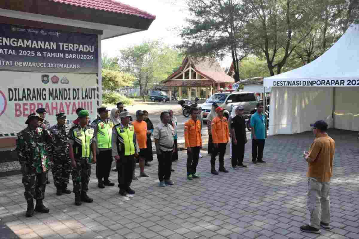 WASP76NEWS.COM||Purworejo – Guna menjamin keamanan dan kenyamanan pengunjung selama libur Natal 2025 dan Tahun Baru 2026 (Nataru), Dinas Kepemudaan, Olahraga dan Pariwisata (Dinporapar) Kabupaten Purworejo bersama jajaran personel gabungan menggelar apel kesiapsiagaan di kawasan Pantai Dewaruci, Jatimalang, Kabupaten Purworejo, Kamis (25/12/2025). Apel ini diikuti oleh tim SAR Dewaruci, Pokdarwis Dewaruci, TNI AL, Koramil Purwodadi, Polsek Purwodadi dan Dinkesda Kabupaten Purworejo, sebagai bentuk sinergi antara pemerintah daerah, aparat keamanan, dan relawan dalam mengantisipasi lonjakan wisatawan.