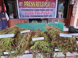 Selain itu, petugas turut mengamankan sejumlah barang bukti narkotika jenis ganja dalam berbagai bentuk. Barang bukti yang ditampilkan dalam press release antara lain 50 batang pohon ganja, 8 batang pohon ganja, 87 batang pohon ganja, 10 bungkus ganja siap edar, satu bungkus plastik hitam berisi bibit ganja, satu tas hitam berisi ganja, serta dua bungkus plastik hitam kecil berisi ganja.